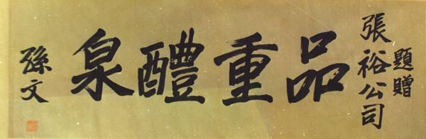 人教版全日制普通高中教科書(shū)《中國(guó)近代現(xiàn)代史》上冊(cè)第二章第三節(jié),刊有孫中山先生在1912年8月21日題贈(zèng)張?jiān)9镜?ldquo;品重醴泉”橫幅原件攝影,圖片注解為“華僑實(shí)業(yè)家張弼士在煙臺(tái)獨(dú)資創(chuàng)辦張?jiān)F咸丫乒尽O中山曾為這家民族企業(yè)題詞”。